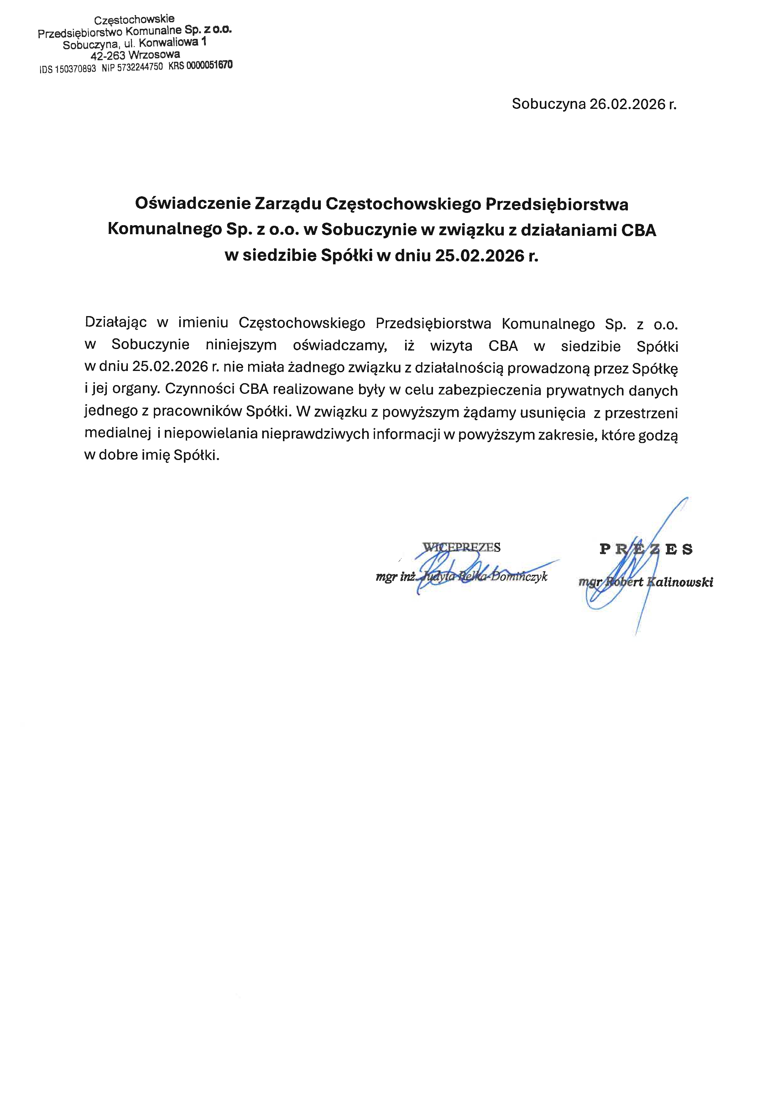 Oświadczenie Zarządu Częstochowskiego Przedsiębiorstwa Komunalnego Sp. z o.o. w Sobuczynie w związku z działaniami CBA w siedzibie Spółki w dniu 25.02.2026 r.