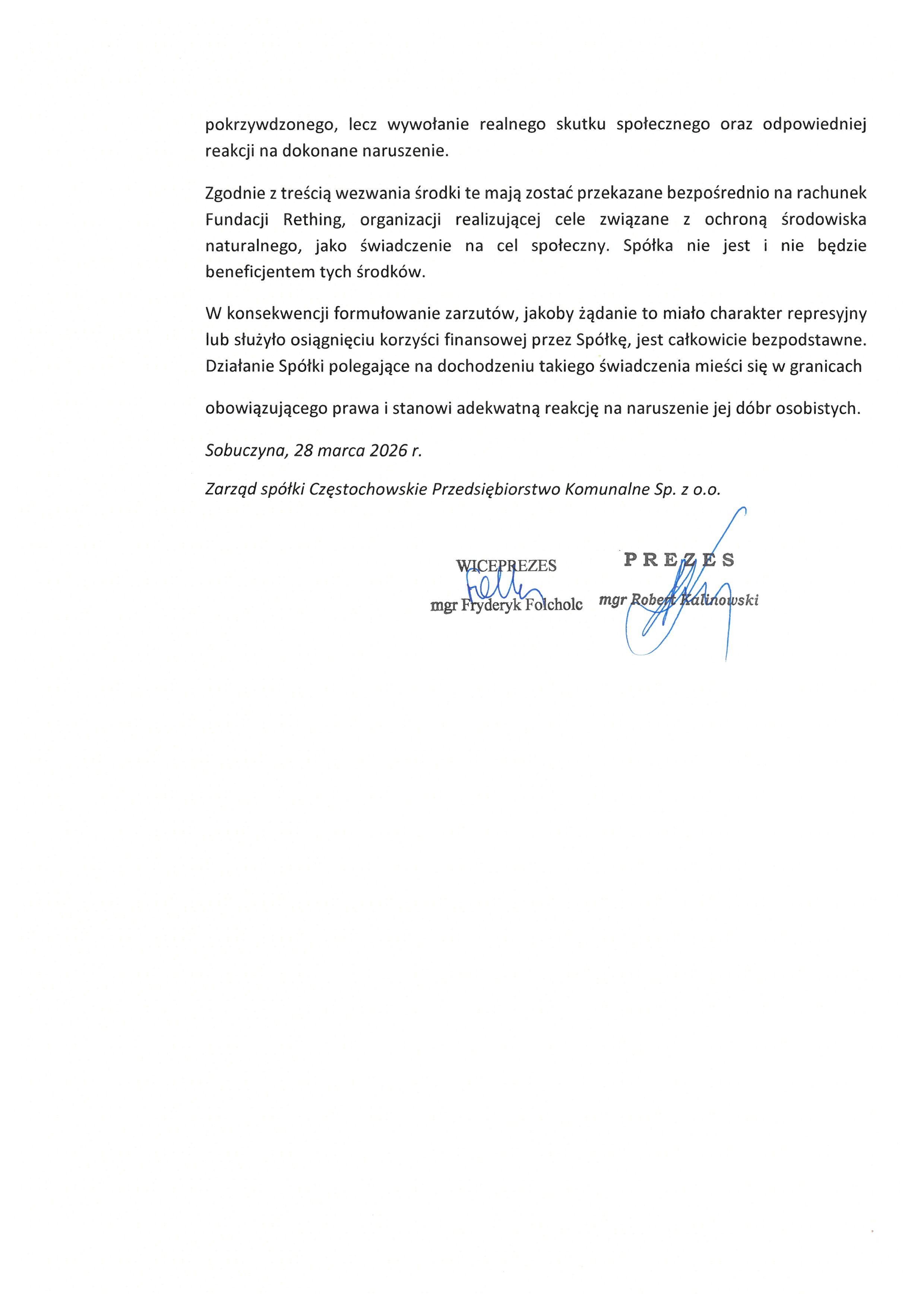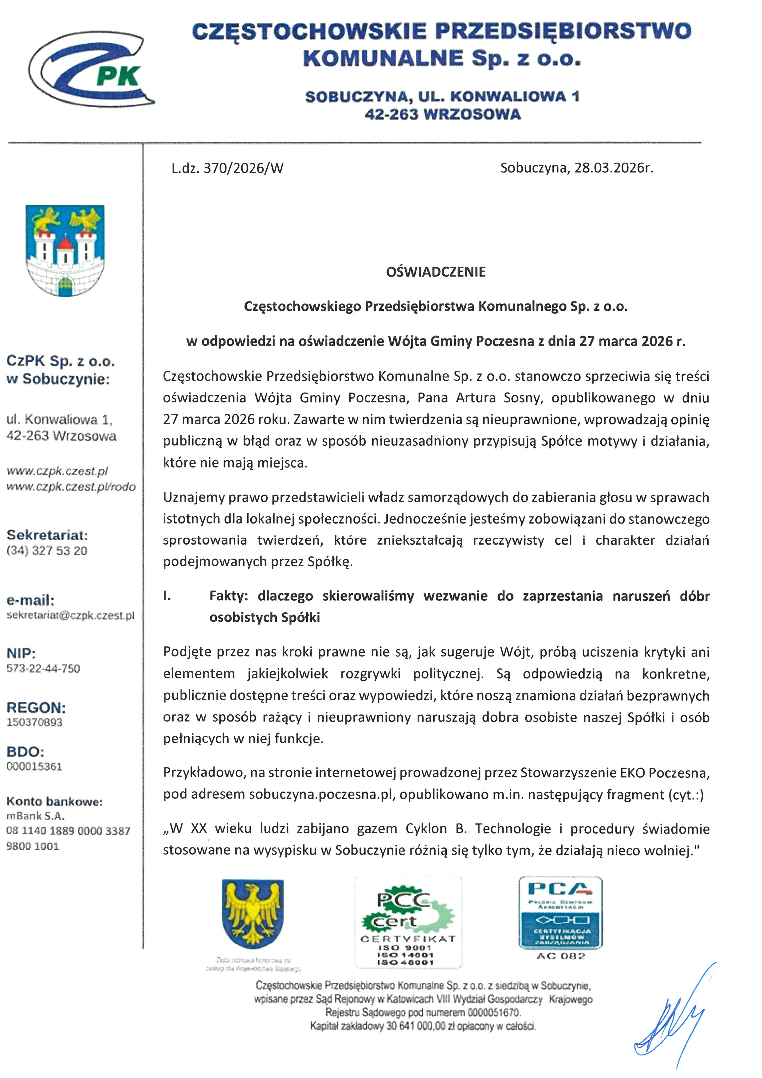 Jesteś tutaj: Strona główna / Aktualności / Oświadczenie Częstochowskiego Przedsiębiorstwa Komunalnego Sp. z o.o. w odpowiedzi na oświadczenie Wójta Gminy Poczesna z dnia 27 marca 2026 r.